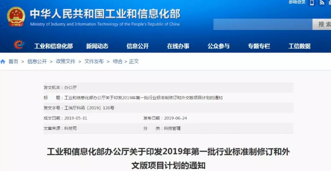 6月24日,工业和信息化部办公厅发布了关于印发2019年第一批行业标准制修订和外文版项目计划的通知。通知称,为做好工业通信业标准化工作,根据工业通信业行业标准制修订工作总体安排,工业和信息化部编制完成了2019年第一批行业标准制修订和外文版项目计划。