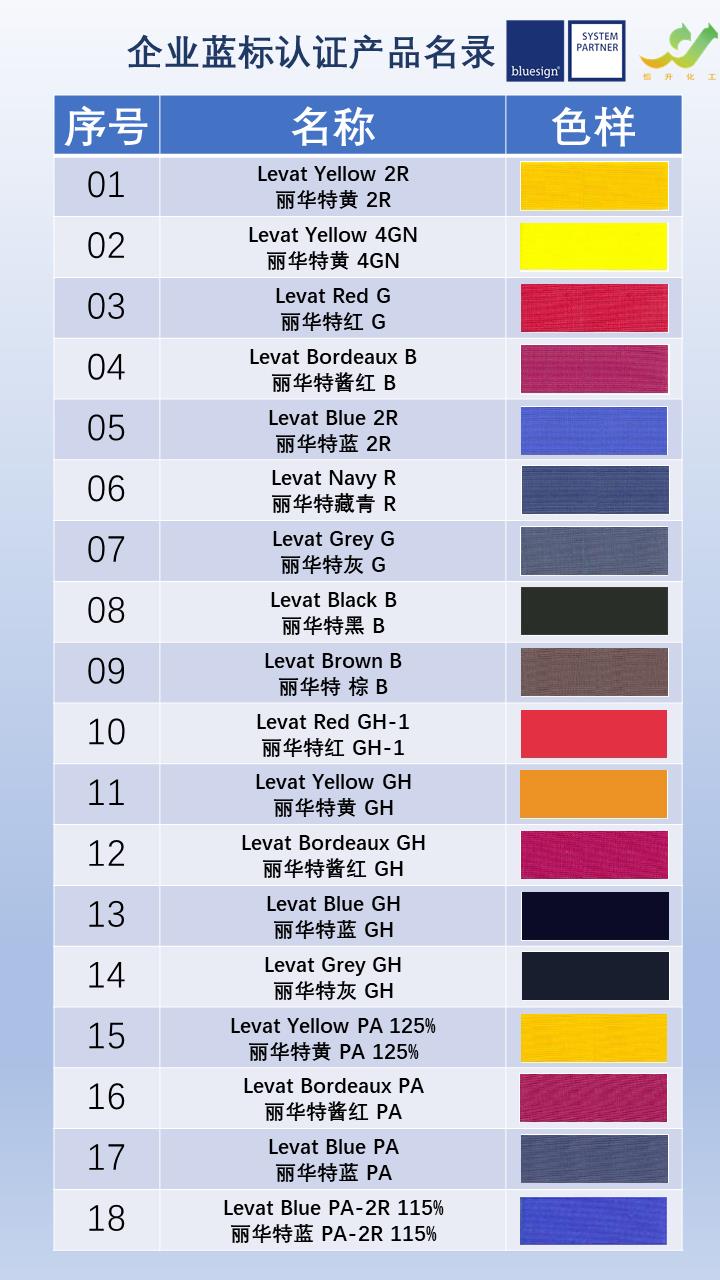 我们在企业规划的时候,就把蓝标认证作为与产品性能同样重要的因素进行考量,最终选择同时满足环保和性能这2个条件。现在,在我们已有的84款酸性染料产品中,其中有18款已经获得蓝标认证,如Levat Yellow 2R/丽华特黄 2R,Levat Red GH-1/丽华特红 GH-1,Levat Blue PA/丽华特蓝 PA等。